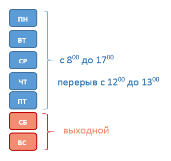 Понедельник – пятница с 08-00 до 17-00, перерыв с 12-00 до 13-00