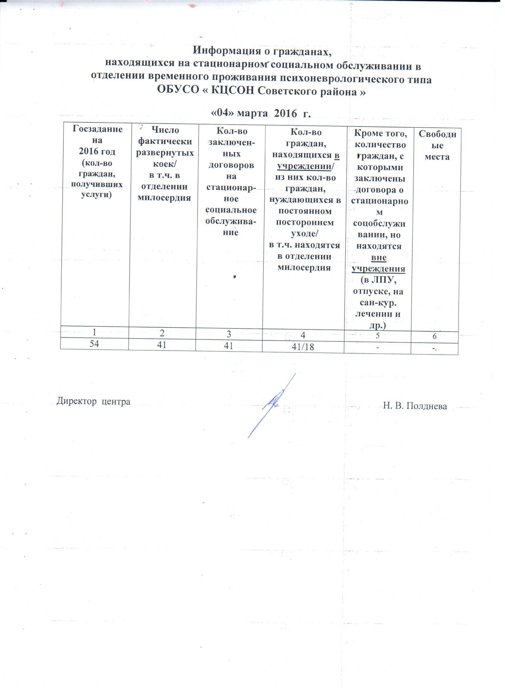 Информация о гражданах, находящихся на стационарном социальном обслуживании в отделении временного проживания психоневрологического типа ОБУСО « КЦСОН Советского района » «04» марта 2016г.