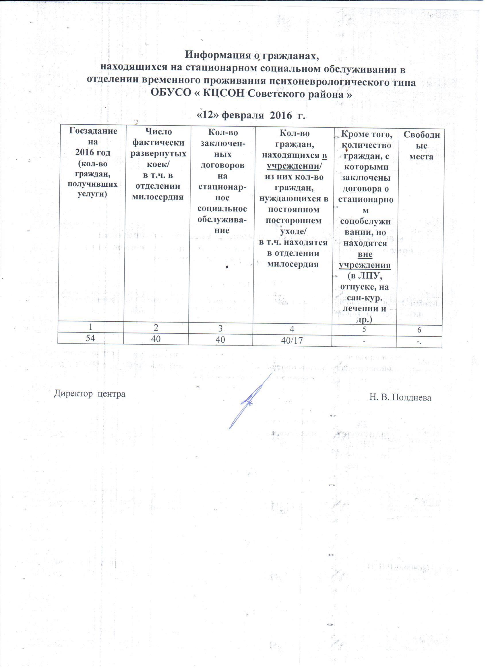 Информация о гражданах, находящихся на стационарном социальном обслуживании в отделении временного проживания психоневрологического типа ОБУСО « КЦСОН Советского района » «12» февраля 2016 г.