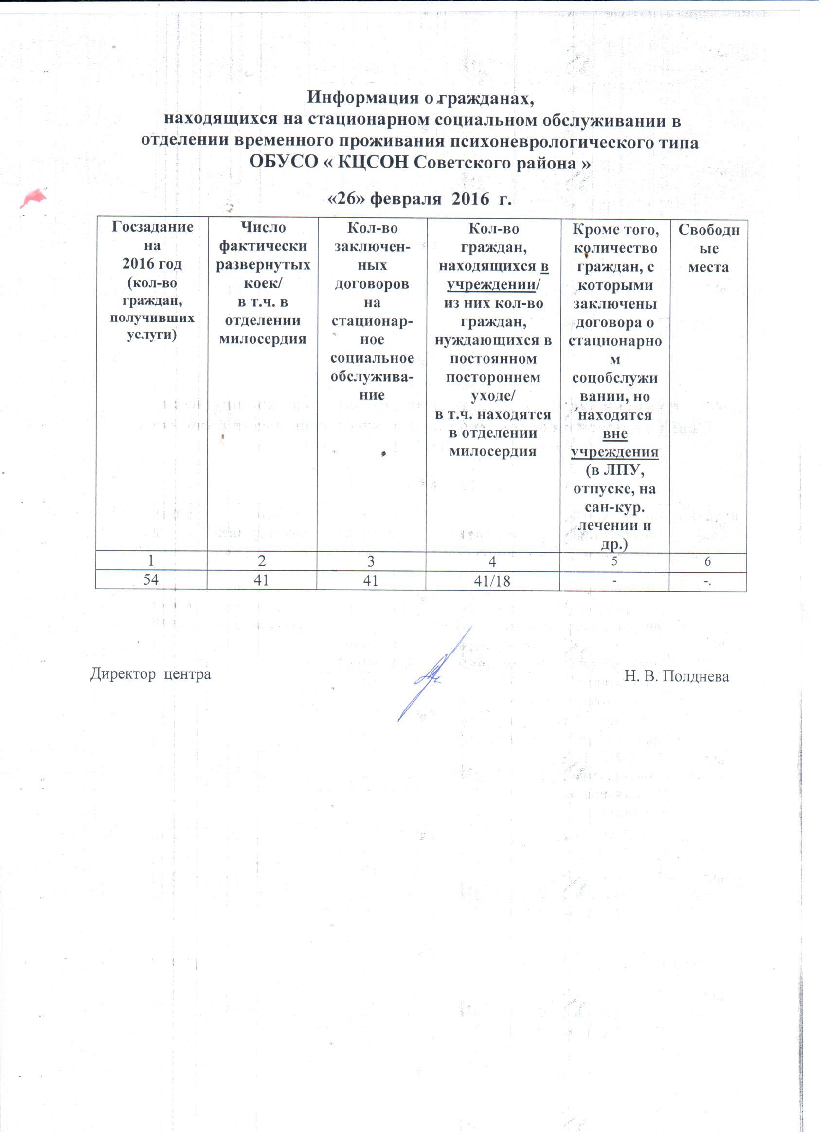 Информация о гражданах, находящихся на стационарном социальном обслуживании в отделении временного проживания психоневрологического типа ОБУСО « КЦСОН Советского района » «26» февраля 2016 г.