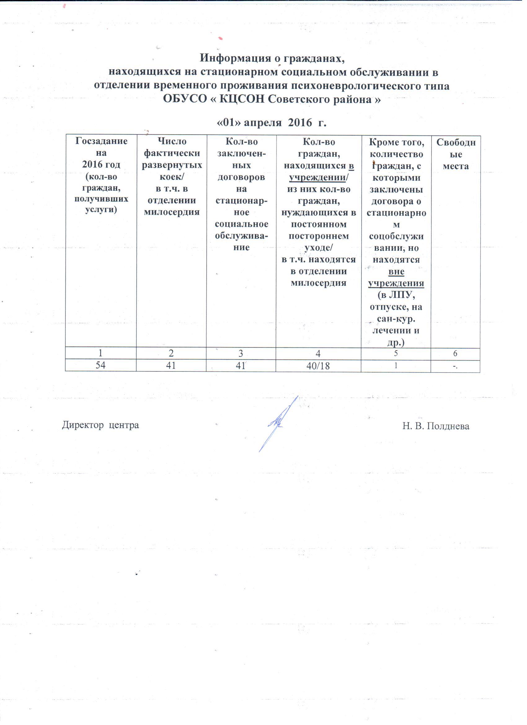 Информация о гражданах, находящихся на стационарном социальном обслуживании в отделении временного проживания психоневрологического типа ОБУСО « КЦСОН Советского района » «01» апреля 2016 г.