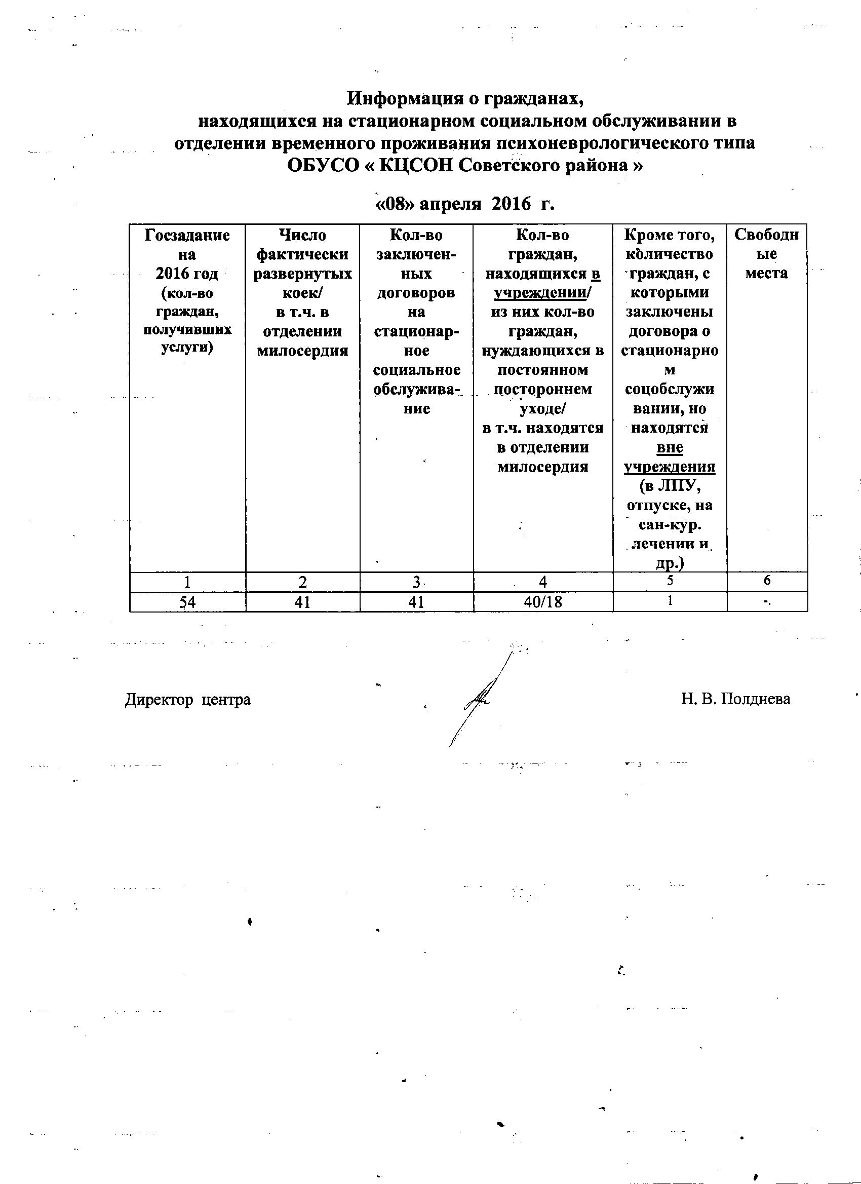 Информация о гражданах, находящихся на стационарном социальном обслуживании в отделении временного проживания психоневрологического типа ОБУСО « КЦСОН Советского района » «08» апреля 2016 г.