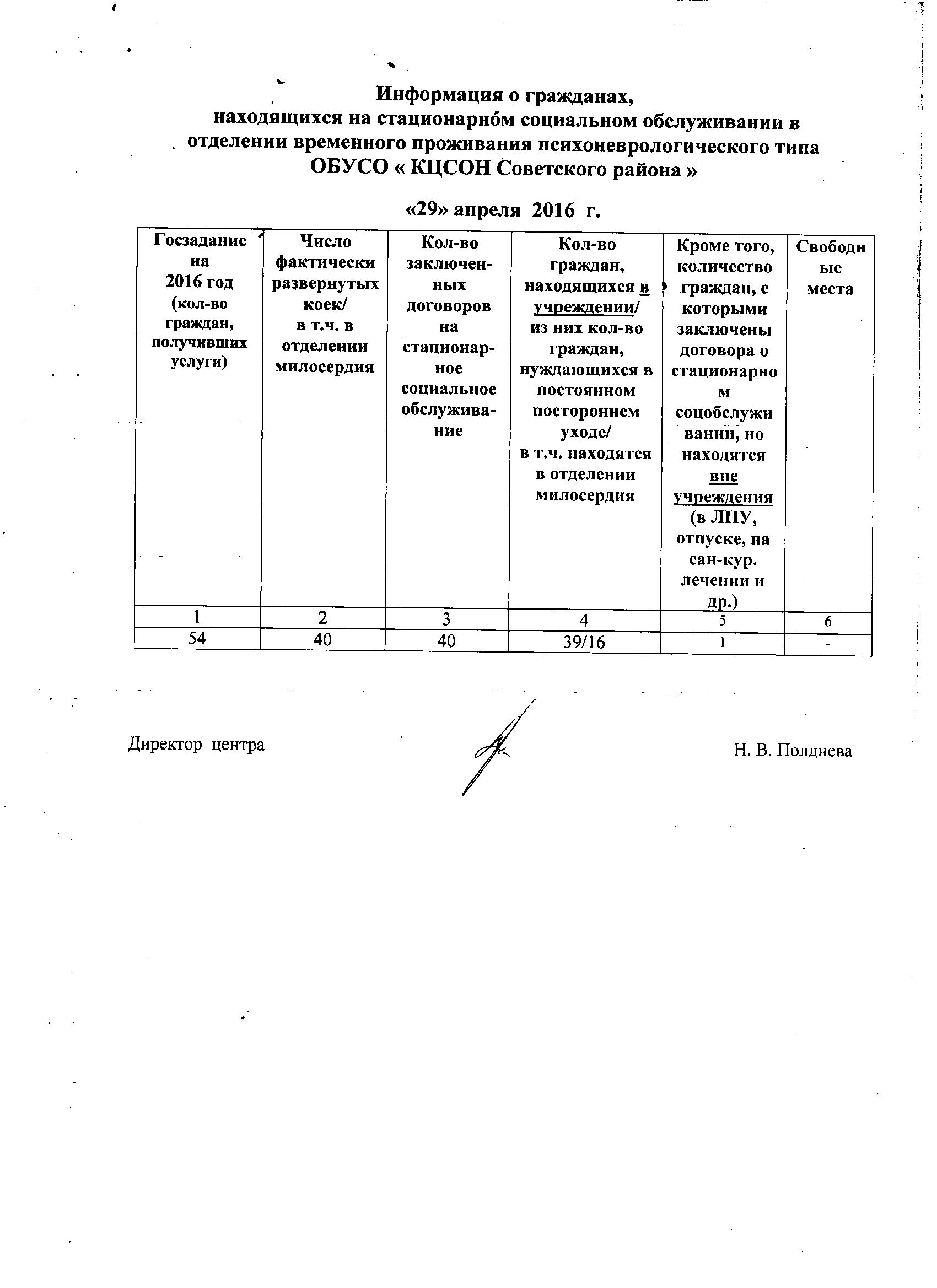 Информация о гражданах, находящихся на стационарном социальном обслуживании в отделении временного проживания психоневрологического типа ОБУСО « КЦСОН Советского района » «29» апреля 2016 г.