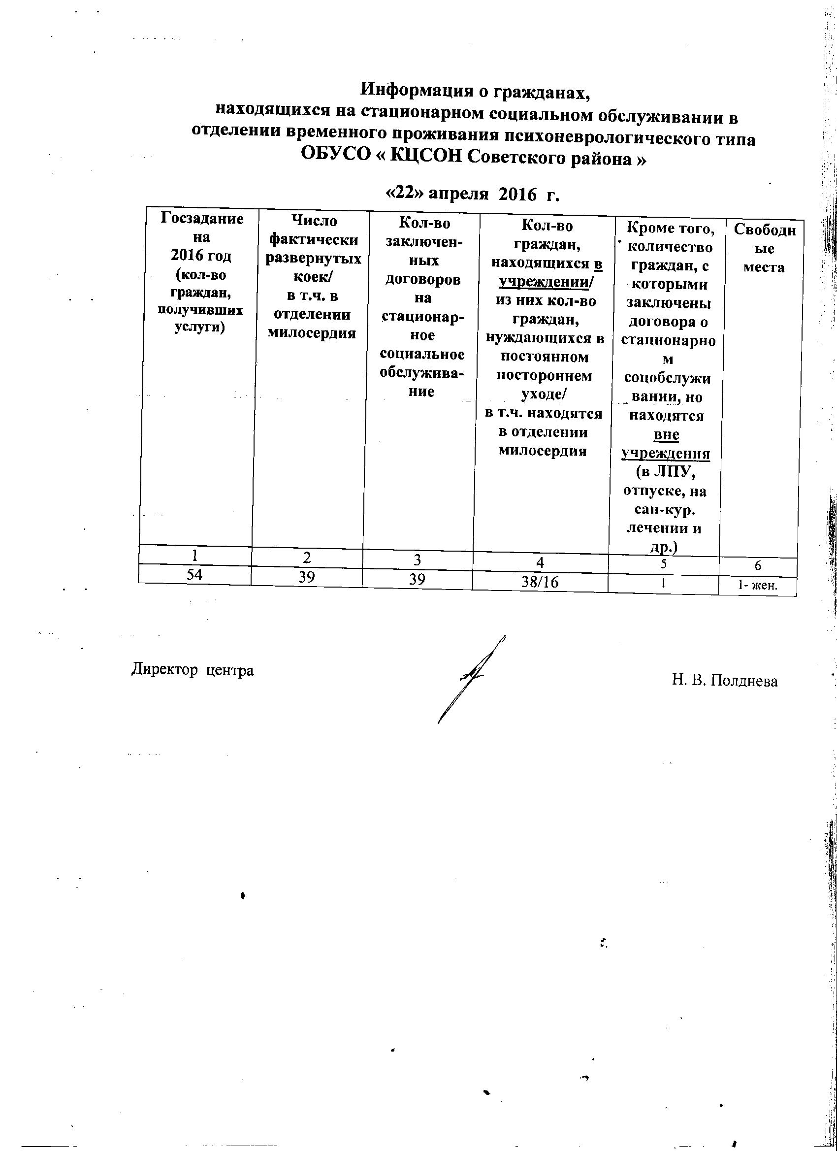 Информация о гражданах, находящихся на стационарном социальном обслуживании в отделении временного проживания психоневрологического типа ОБУСО « КЦСОН Советского района » «22» апреля 2016 г.
