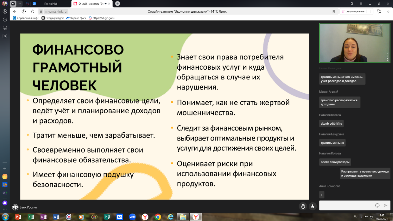 Слушатели на лекции узнали о том, как научиться определять финансовые цели, составлять планы по их достижению. Ведущая вебинара познакомила с современными способами ведения бюджета, формирования и сбережения активов, дала представление о том, как не потратить лишнего и при этом заработать.