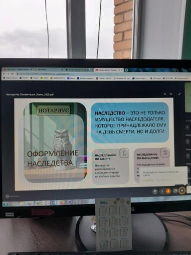 Слушатели узнали кто является наследниками первой и второй очереди, как правильно оформить завещание, как принять наследство. На занятии обучающиеся имели возможность задать вопрос и получить ответ. Уяснили для себя, что наследство- это не только имущество наследодателя, но и его долги на день смерти.