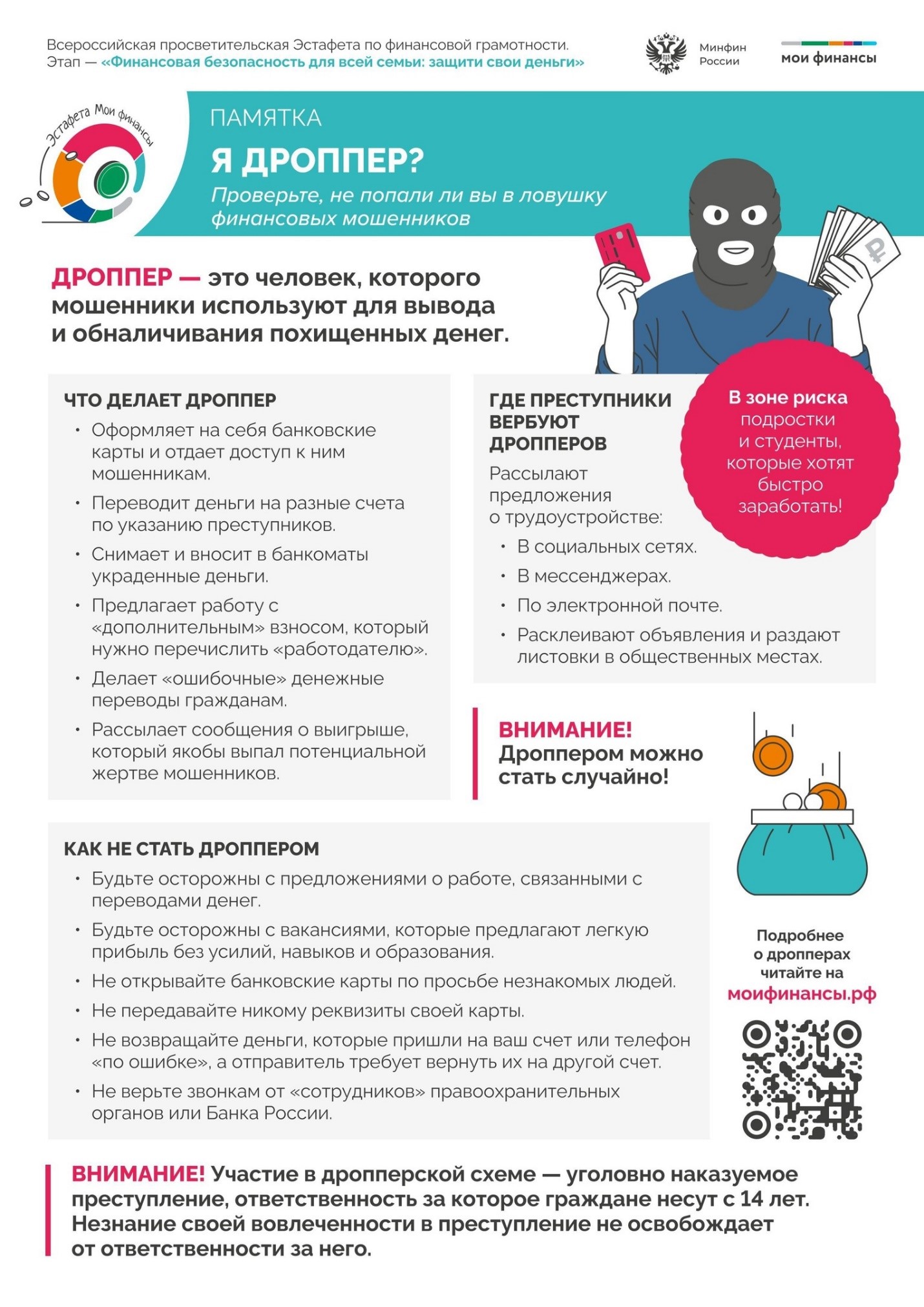 Кто такой дроппер и как не стать соучастником преступления, рассказываем в карточках