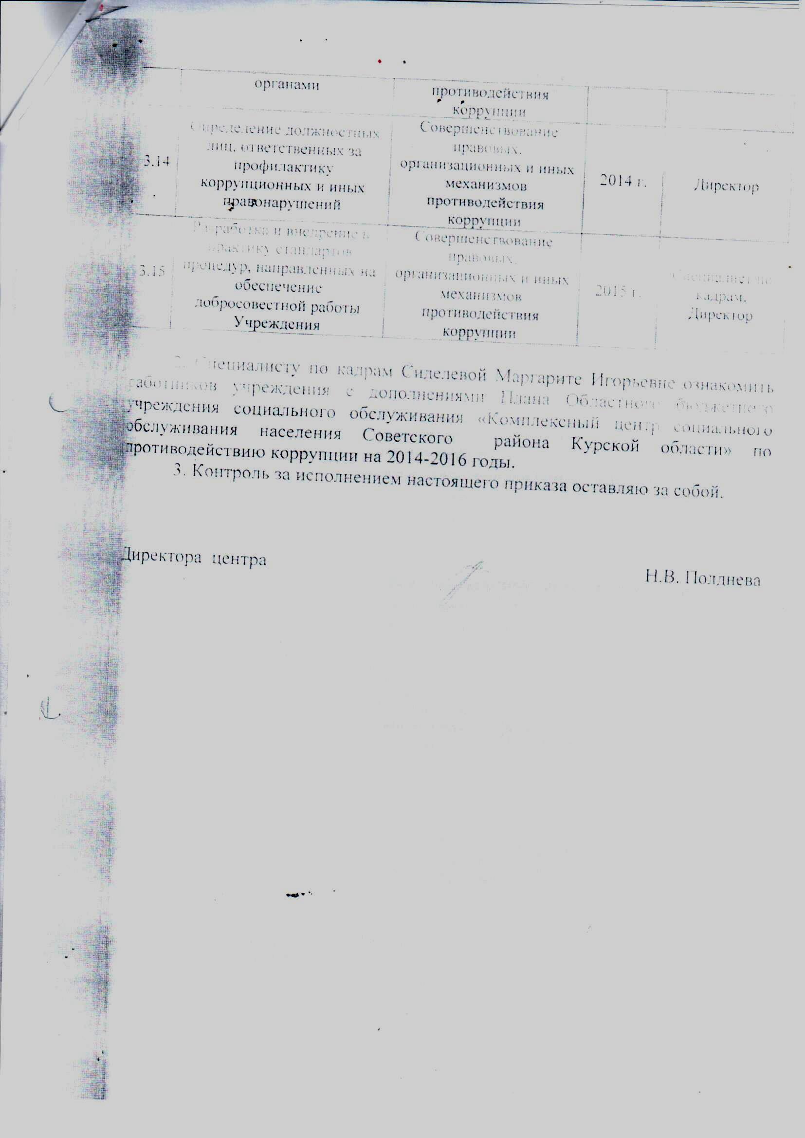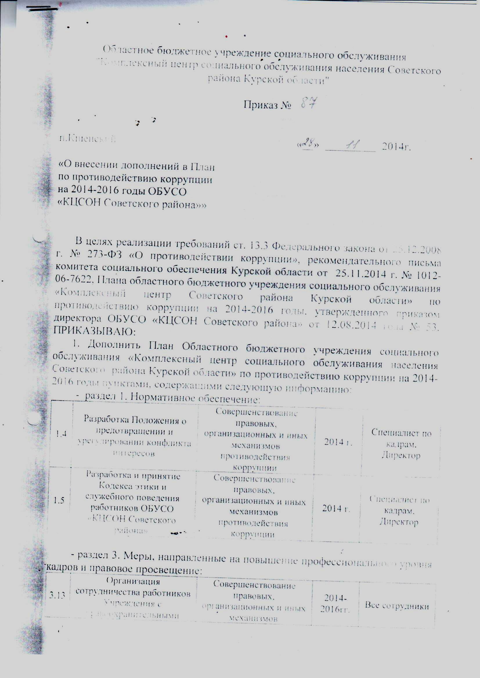 Приказ № 87 от 27.11.2014г. "О внесении дополнений в План по противодействию коррупции на 2014-2016 годы ОБУСО "КЦСОН Советского района"
