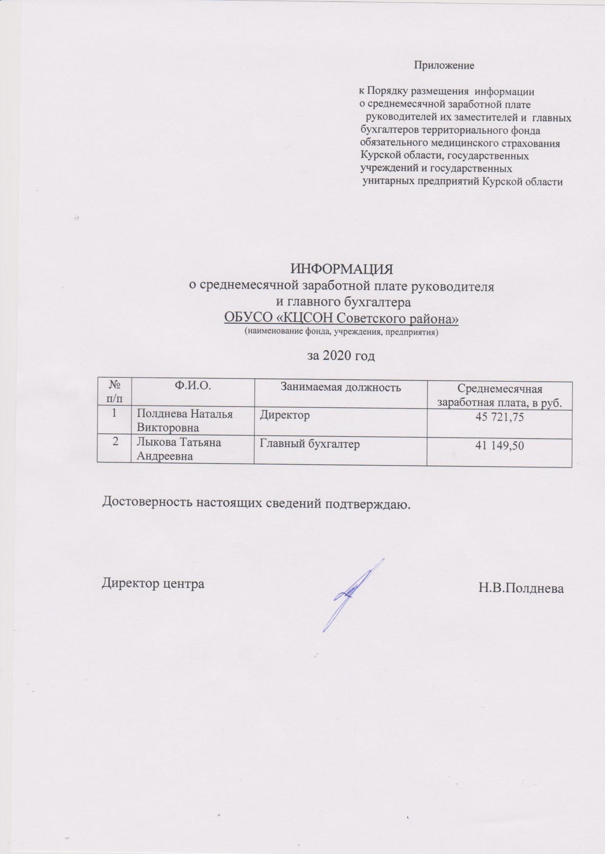 Информация о среднемесячной заработной плате руководителя и главного бухгалтера за 2020 год